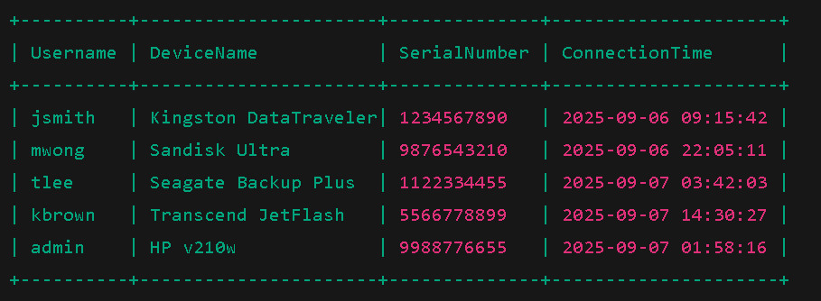 Velociraptor can monitor USB device activity to detect potential data exfiltration. It tracks device names, serial numbers, and connection times, allowing analysts to flag unauthorized usage and quickly investigate suspicious activity. NOTE: If USB ports are disabled, no connection events will appear. Though admin can check on Velociraptor to ensure there are no USB connection in the VQL logs.