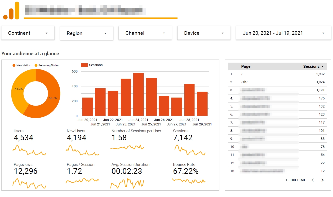 | Pages per Session | Page visits during the session. Useful to check which page is popular and users preferred language. |